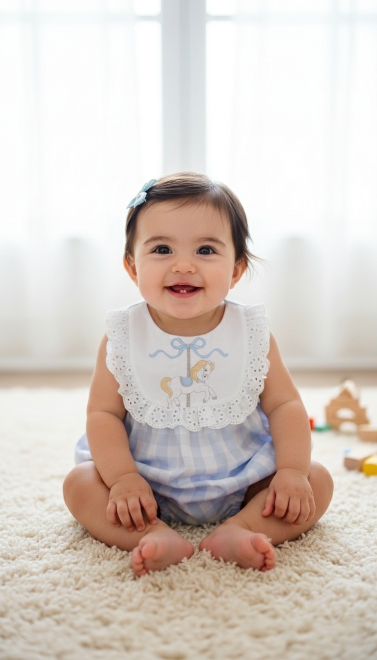 O bordado do cavalinho de carrossel dá o toque final: doce, encantador e cheio de poesia — como as memórias da infância devem ser.